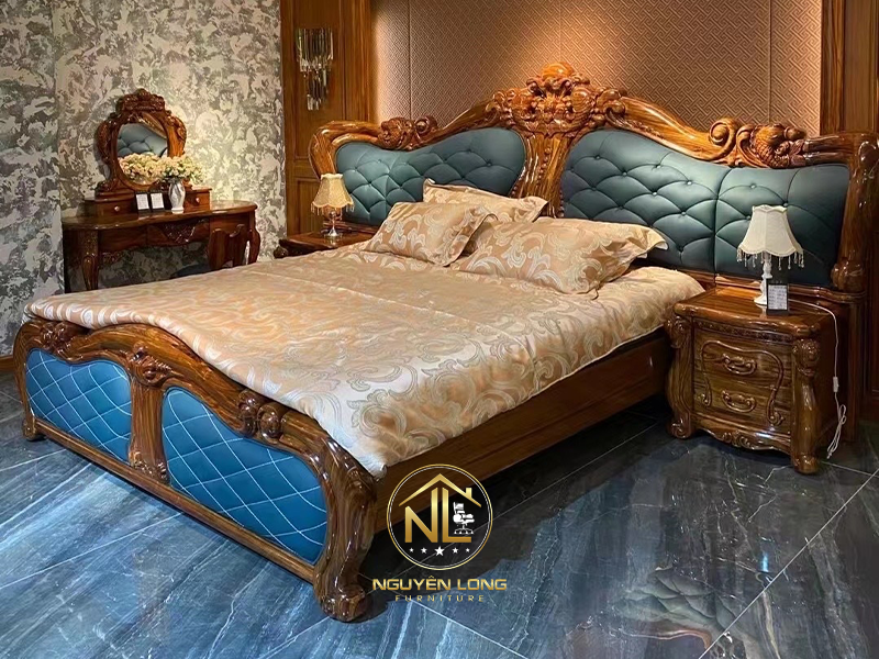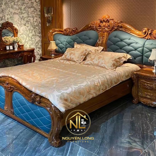 Mẫu giường ngủ tân cổ điển nhập khẩu GNK006 là sự kết hợp hoàn hảo giữa nghệ thuật chạm khắc tinh xảo và vẻ đẹp mềm mại của phong cách hoàng gia châu Âu. Sản phẩm gây ấn tượng bởi tông gỗ nâu sáng bóng mịn cùng lớp bọc da xanh ngọc nhạt sang trọng, tạo cảm giác vừa thanh thoát, vừa quý phái. Không chỉ là nơi nghỉ ngơi thư giãn, GNK006 còn là điểm nhấn nổi bật giúp không gian phòng ngủ trở nên ấm cúng, đẳng cấp và tràn đầy cảm xúc.