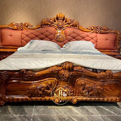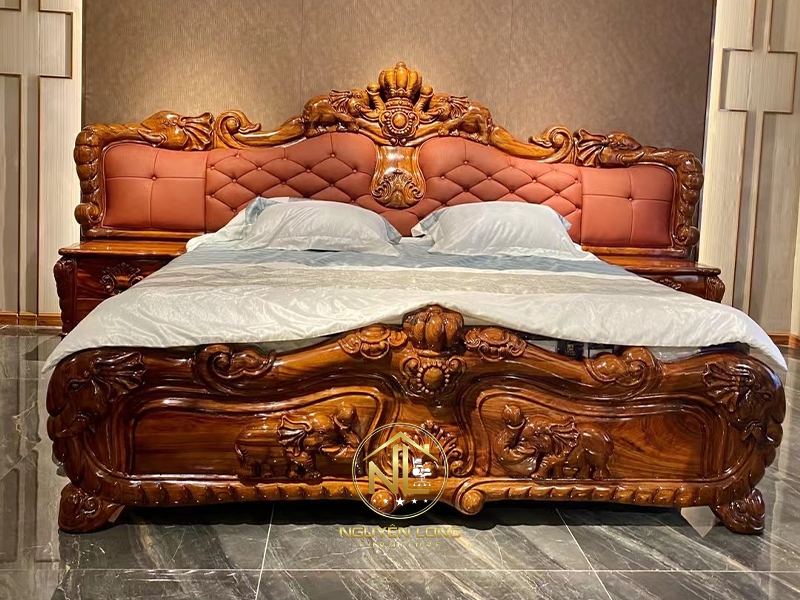 Với khung gỗ tự nhiên chạm khắc cầu kỳ và phần bọc da nâu đỏ sang trọng, sản phẩm mang đến vẻ đẹp vừa ấm áp, vừa quyền quý, thể hiện đẳng cấp và gu thẩm mỹ tinh tế của gia chủ.
