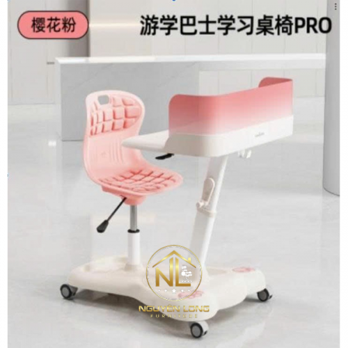 Kết cấu nổi bật: Ghế nhựa Công Thái Học + mặt bàn liền có thành chắn + đế lớn có bánh xe